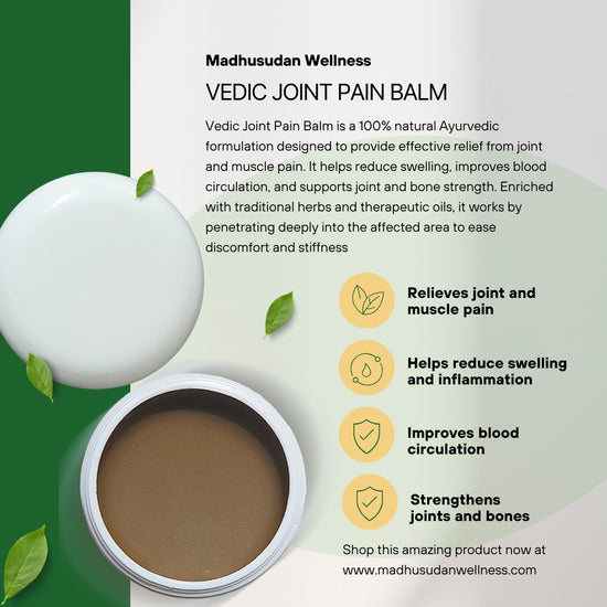 Vedic Joint Pain Balm is a 100% natural Ayurvedic formulation developed to provide effective relief from joint and muscle pain. Enriched with traditional herbs and therapeutic oils, it helps reduce swelling and inflammation while improving blood circulation in the affected area. Regular use supports joint flexibility, strengthens bones, and eases stiffness, offering a soothing and warming effect for long-lasting comfort.
